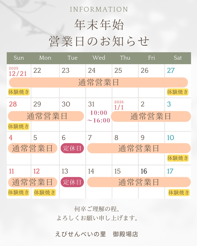 【おせんべい焼き体験コーナー開催日】のご案内