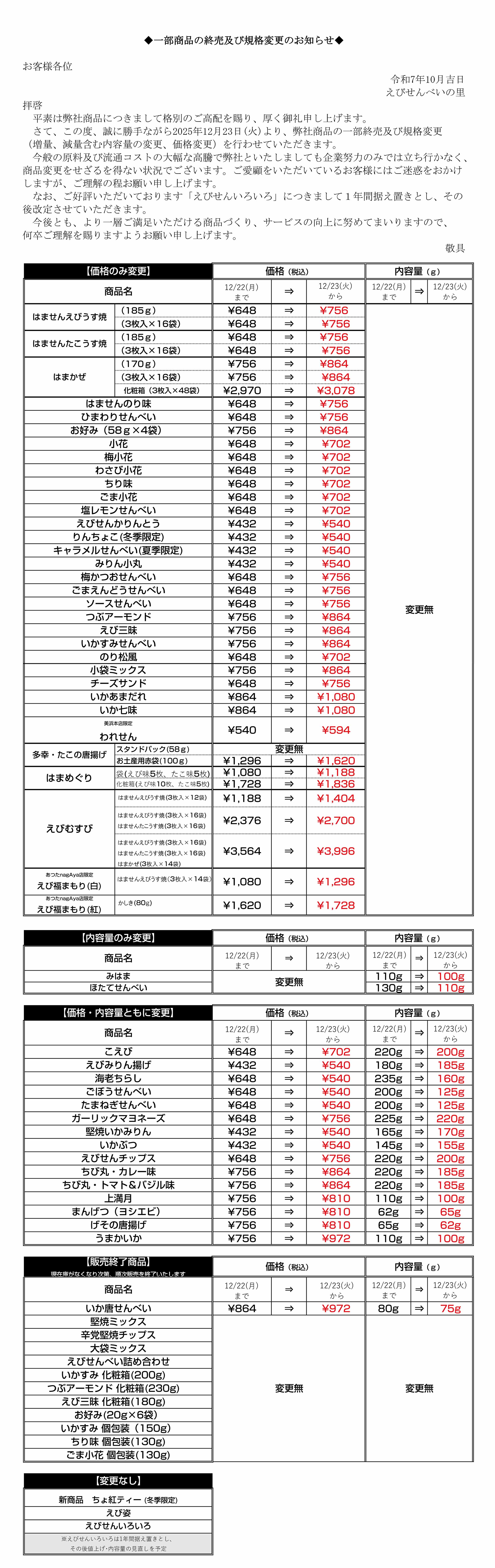 1.対象商品および内容量改定一覧・・・下記の表をご参照ください